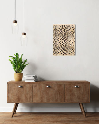 The blocks are painted in black paint with the faces sanded to reveal the end grain of the wood. There is a frame and backing board around the piece for easy wall hanging.
