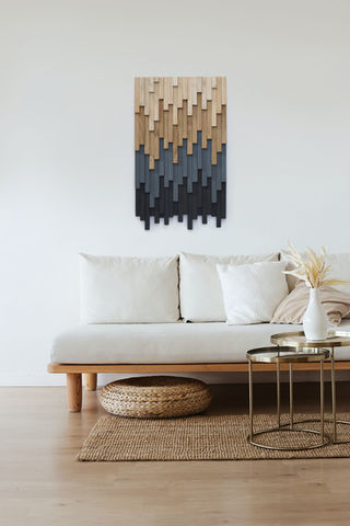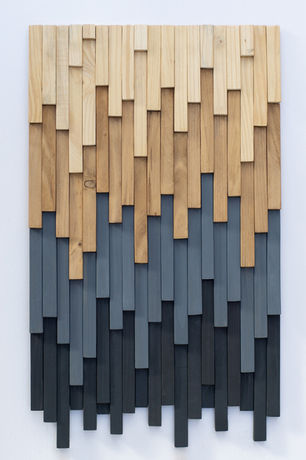Original Wall Art made of individual wedges of pine wood. The wedges are painted and stained to create a tonal gradient. There is a frame and backing board around the piece for easy wall hanging.